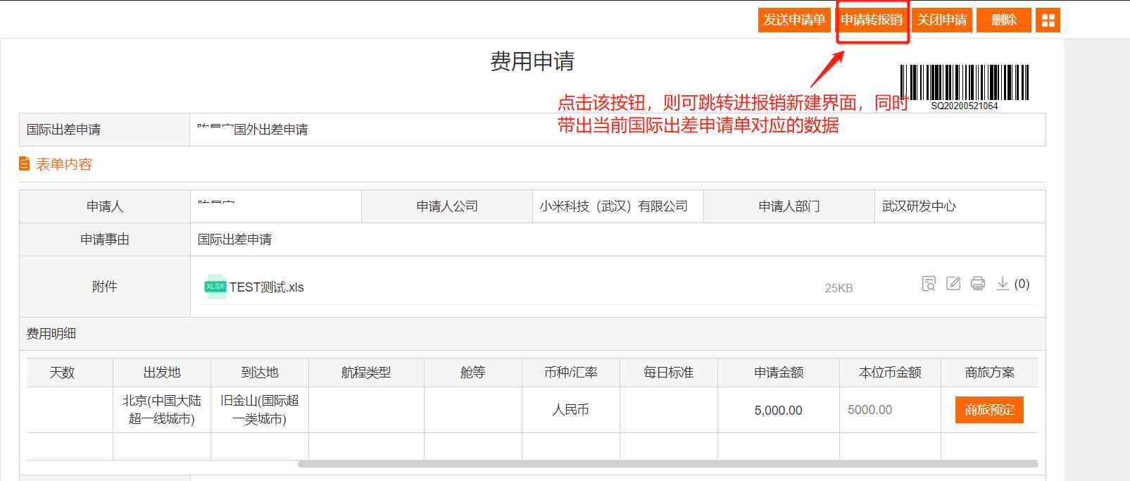 支持在線發(fā)起國內(nèi)出差、國際出差、通用費用、米家活動、市場活動等事前申請。系統(tǒng)自動帶入申請人、申請人部門信息,申請事由、費用明細、日期、附件等一站式填寫登記,提交審批。出差申請審批流程結(jié)束后,申請人可通過“商旅預定”按鈕,單點登陸攜程商旅平臺,進行機票、火車票、酒店的預定。同時,事前申請可快捷關(guān)聯(lián)轉(zhuǎn)報銷。操作流暢省心,員工體驗感好,執(zhí)行效率高。