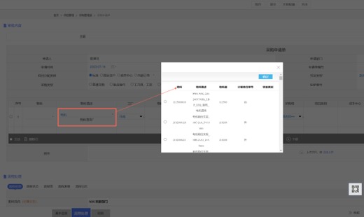 step1:發(fā)起申請(qǐng)時(shí),可選擇要采購(gòu)的物料,系統(tǒng)自動(dòng)帶出相關(guān)信息