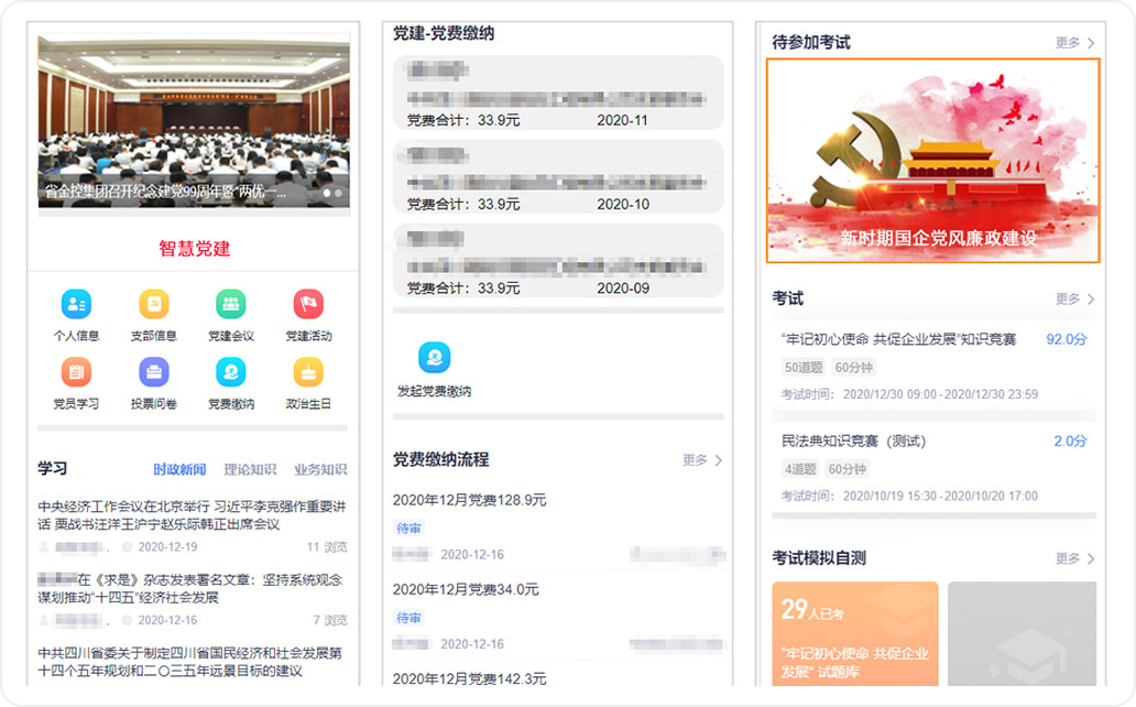 針對(duì)大型國(guó)企各支部黨員較分散,集中學(xué)習(xí)的不便,將黨章黨規(guī)、總書(shū)記系列講話、黨建制度和應(yīng)知應(yīng)記等相關(guān)知識(shí)與課程搬到線上,拓寬了黨員員工學(xué)習(xí)渠道,結(jié)合移動(dòng)化考試,快速驗(yàn)證學(xué)習(xí)成果,推進(jìn)學(xué)用結(jié)合。