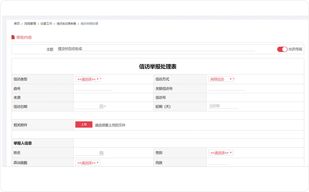 將信訪流程全程在線化,支持在閱讀完“信訪指南”后一鍵發(fā)起“舉報(bào)管理”,受理人在收到相關(guān)待辦后,填寫處理信息,舉報(bào)人可隨時(shí)查看進(jìn)度,讓信訪全過(guò)程留痕,便于各類信訪舉報(bào)件高效處理。