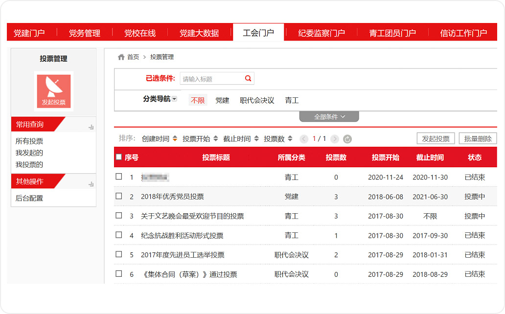 針對(duì)國(guó)企黨紀(jì)團(tuán)群工作中投票事項(xiàng)較多,線下投票費(fèi)時(shí)費(fèi)力的情況,采用在線問(wèn)卷與投票管理,輕松完成工會(huì)選舉、活動(dòng)投票等工作,統(tǒng)計(jì)結(jié)果更快速,更透明。