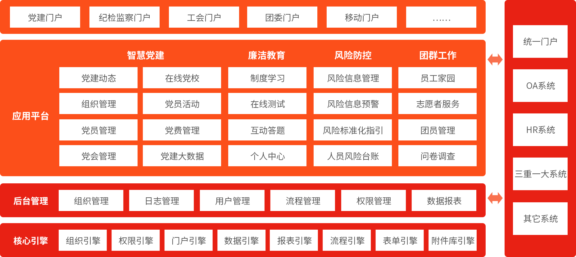 通過(guò)黨建新聞、黨委公文、組織管理、黨員管理、黨務(wù)管理、組織生活會(huì)議、在線黨校、黨建大數(shù)據(jù)等應(yīng)用,助力多級(jí)黨組織建設(shè),發(fā)揮基層黨組織戰(zhàn)斗堡壘作用,打造先進(jìn)型組織。
