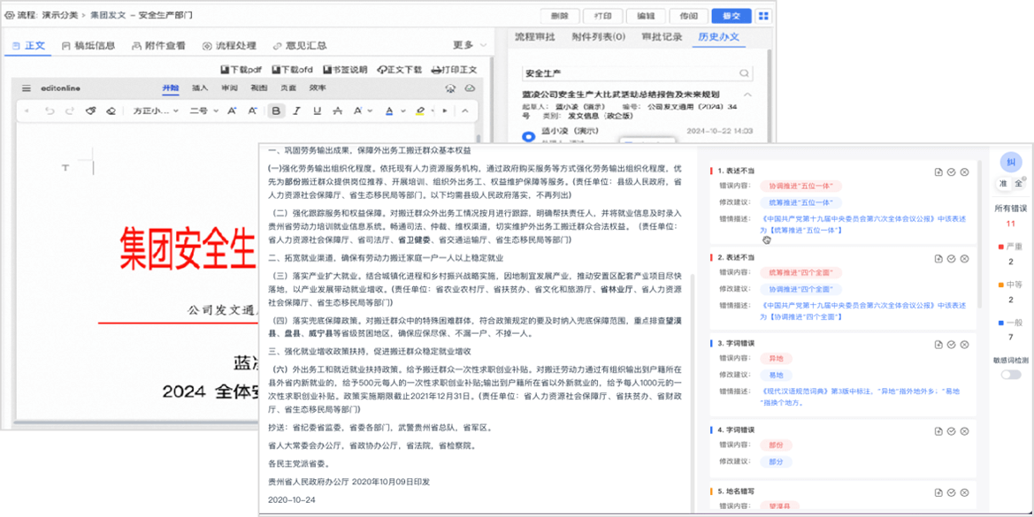 支持國企集團(tuán)各類復(fù)雜公文流轉(zhuǎn)場景,全程留痕;移動簽批更高效;文轉(zhuǎn)督辦,助推執(zhí)行力。引入WPS等"流版簽",滿足信創(chuàng)適配需求