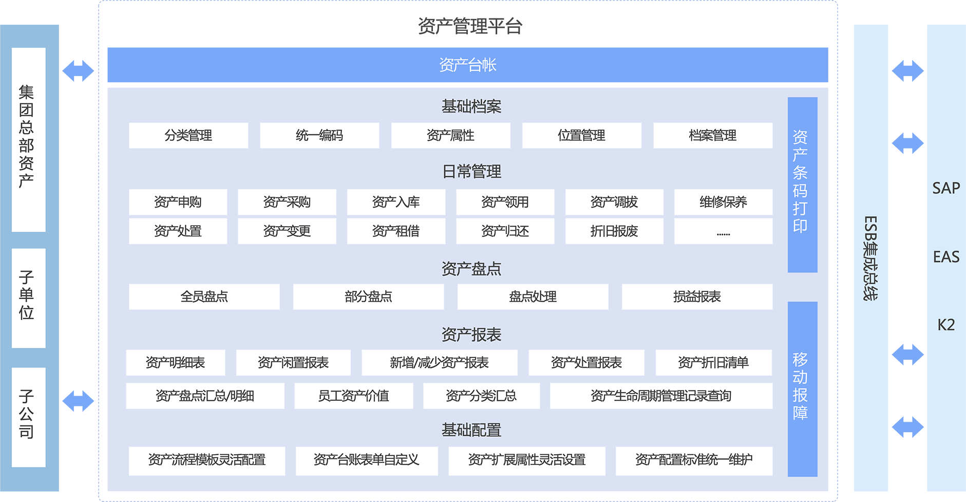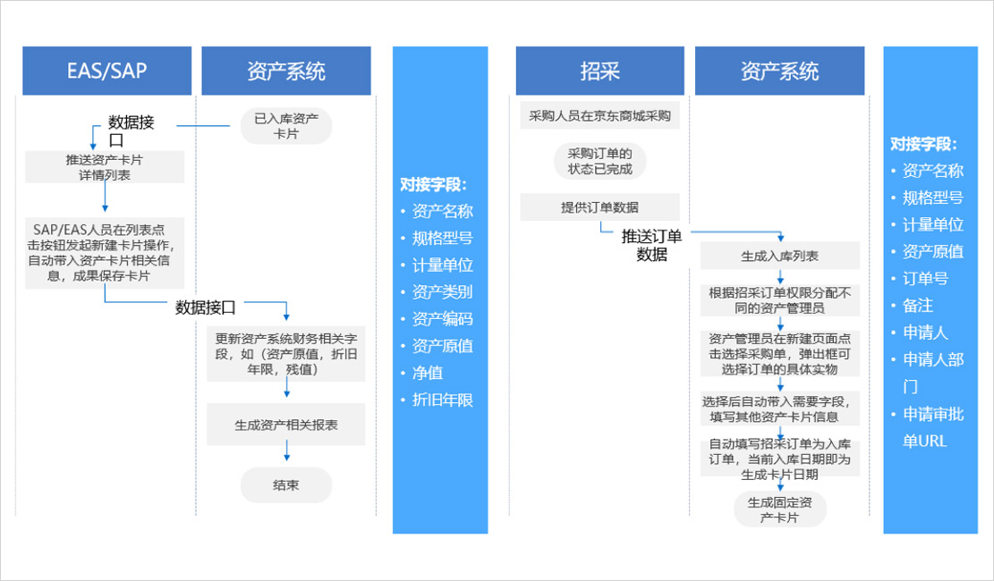 強大集成平臺,可與SAP、金蝶、招采、K2等對接,通過調用財務系統(tǒng)接口,資產與費用映射,資產管理系統(tǒng)中卡片信息及費用科目同步到財務系統(tǒng),實現企業(yè)資產賬實一致。