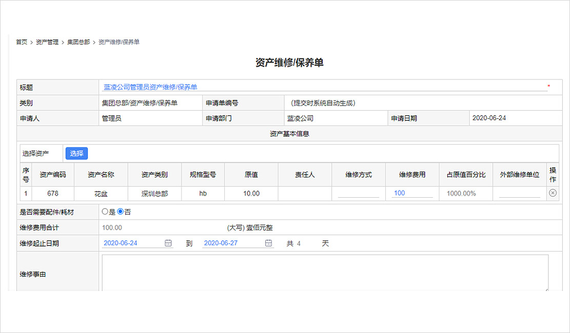 可在線發(fā)起設備、用品領用申請,經資產管理員審批后可領用;自動更新資產卡片、庫存信息。支持各類設備、資產按保修計劃進行維修,可在線發(fā)起維修流程,確保問題高效處理,確保設備可用。推動對資產處置的多方嚴格審批,實現報廢資產的規(guī)范化處理,確保資產處置所得收益入賬。