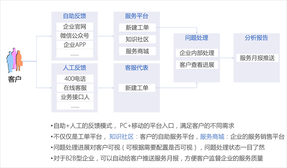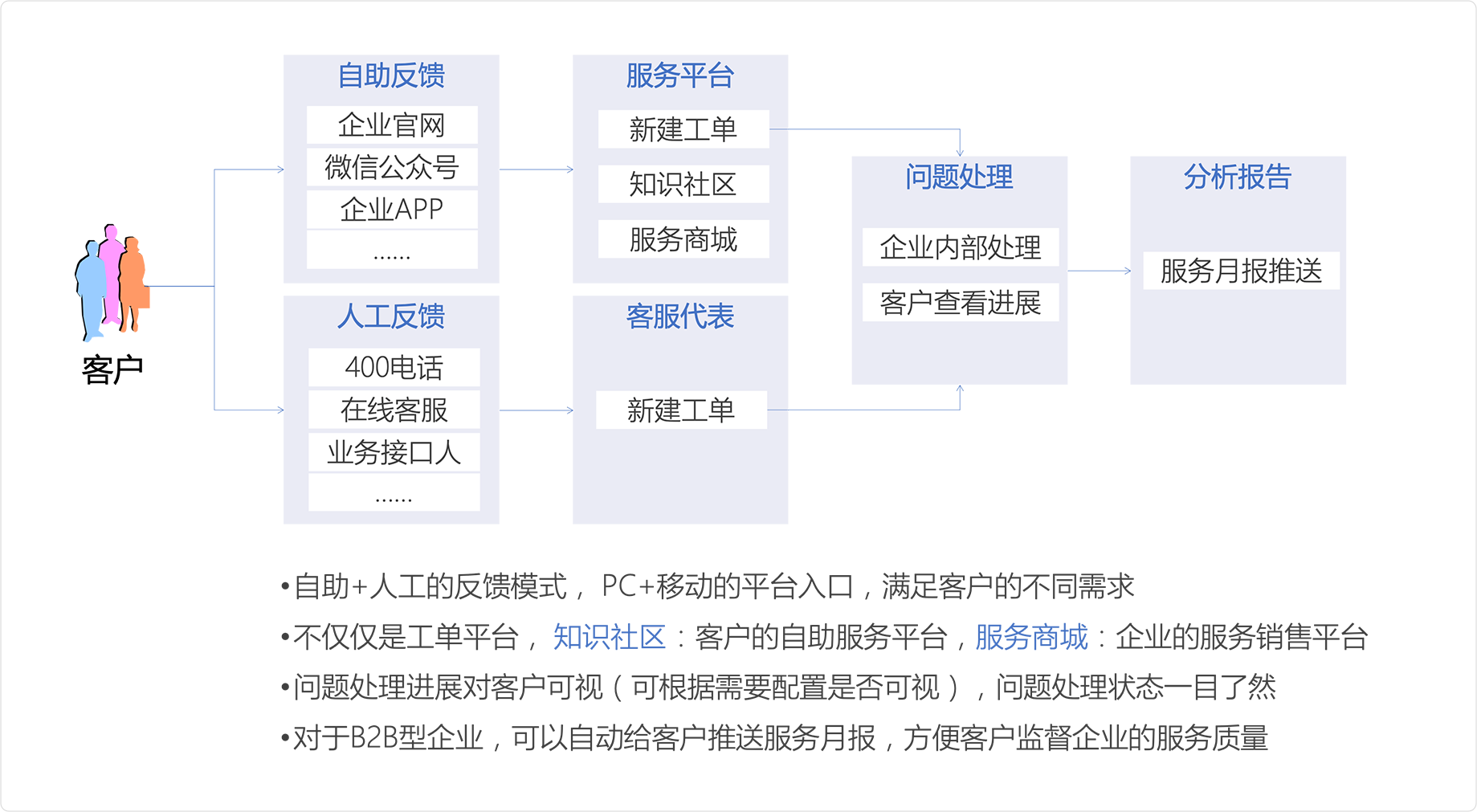 客戶可通過自助反饋渠道反饋問題,系統(tǒng)會自動新建工單,問題自動流向客服專員,專員可根據(jù)問題分派給相應的專家進行問題處理;如果客戶通過人工反饋渠道反饋問題,客服代表將新建相應工單,根據(jù)表單模板填寫好客戶信息、問題信息等內(nèi)容,安排相應專家進行解答