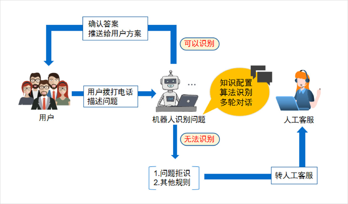 智能客服機器人支持主流呼叫中心與IVR系統(tǒng)對接。當用戶來電咨詢或者智能客服機器人主動進行回訪時,智能客服機器人可根據(jù)原先設(shè)定好的業(yè)務(wù)對話流程,進行語音對話,解答部分常見業(yè)務(wù)問題;如果遇到無法識別的問題,可自動轉(zhuǎn)接給人工客服