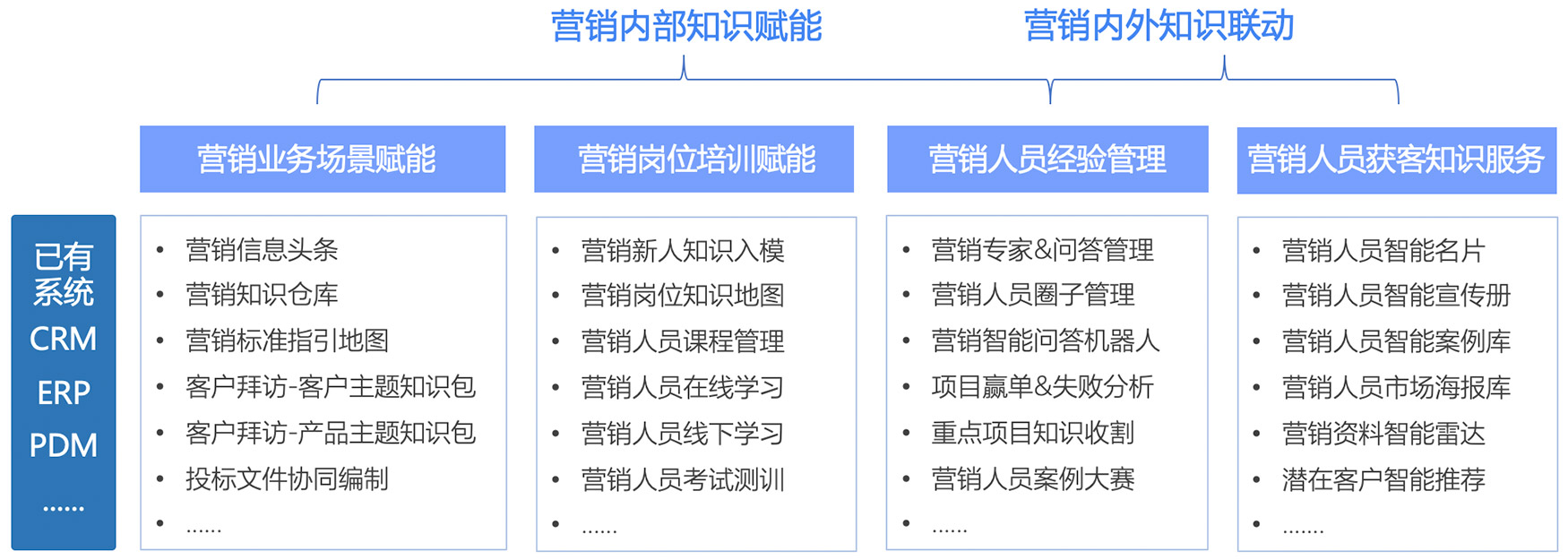 通過構建標準化營銷知識體系、梳理基于SOP的知識專題、構建營銷門戶與營銷地圖、打造知識社區(qū)等,幫助營銷人員快速提升業(yè)務能力;并可為營銷人員量身定制電子化“營銷公文包”,助力獲客。