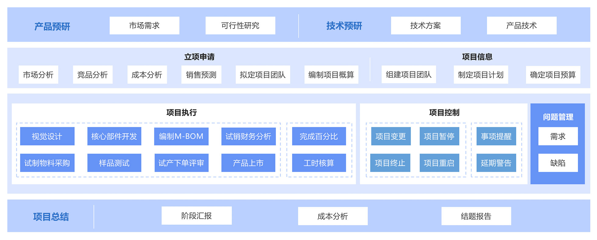 研發(fā)項(xiàng)目管理標(biāo)準(zhǔn)化缺少流程固化,不利于研發(fā)項(xiàng)目全周期PDCA管控。