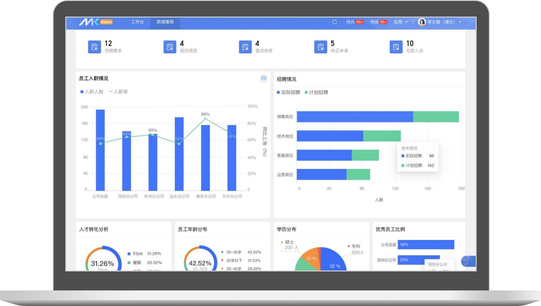 提供員工結(jié)構(gòu)比例、薪酬構(gòu)成、出勤情況、培訓(xùn)考核完成度等維度數(shù)據(jù)分析,助力高層掌控組織情況,調(diào)整人力資源戰(zhàn)略