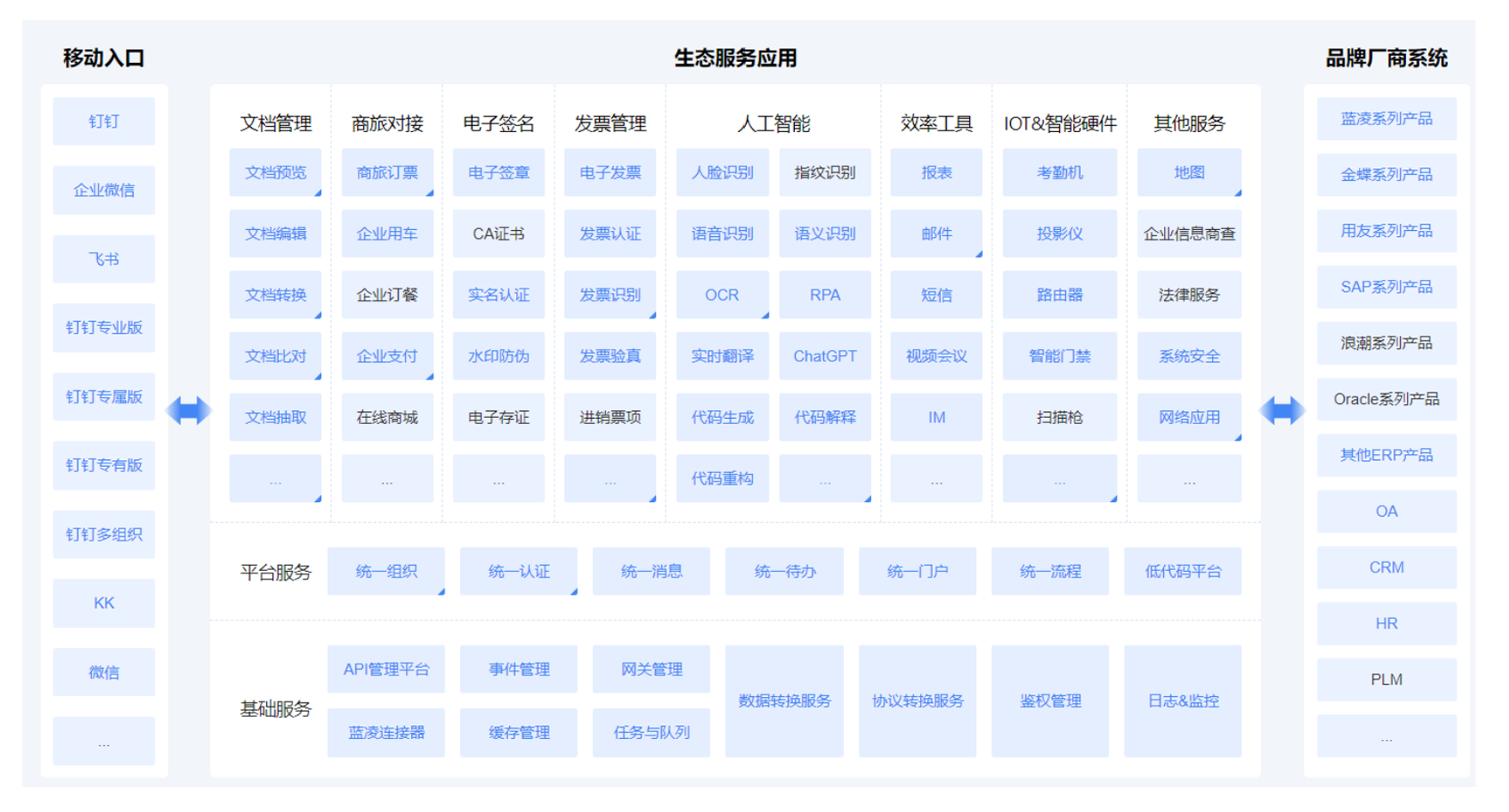 藍凌MK集成平臺支持50+類、1000+軟件、企業(yè)服務、智能硬件等集成,不僅讓業(yè)務與管理更高效,也助力企業(yè)IT運維降本增效,創(chuàng)造更多價值。