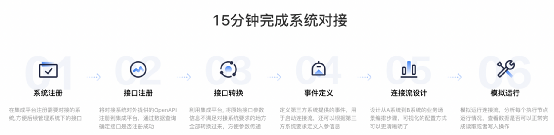 拖拉拽方式實現(xiàn)系統(tǒng)集成更簡單;從系統(tǒng)注冊、接口注冊、接口轉(zhuǎn)換到事件定義、連接流設計、模擬運行,15分鐘實現(xiàn)完成系統(tǒng)對接。
