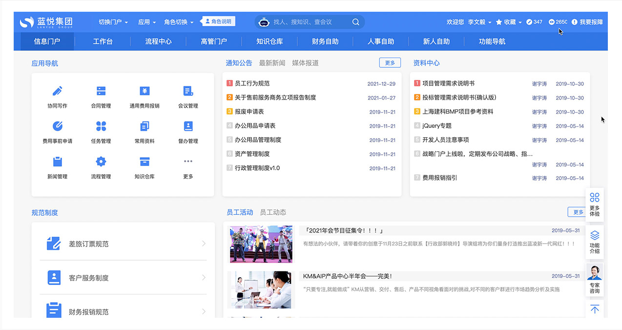 匯集集團(tuán)制度、公文、知識(shí)等信息及流程、應(yīng)用,確保重大政策、工作安排同步、統(tǒng)一管控。