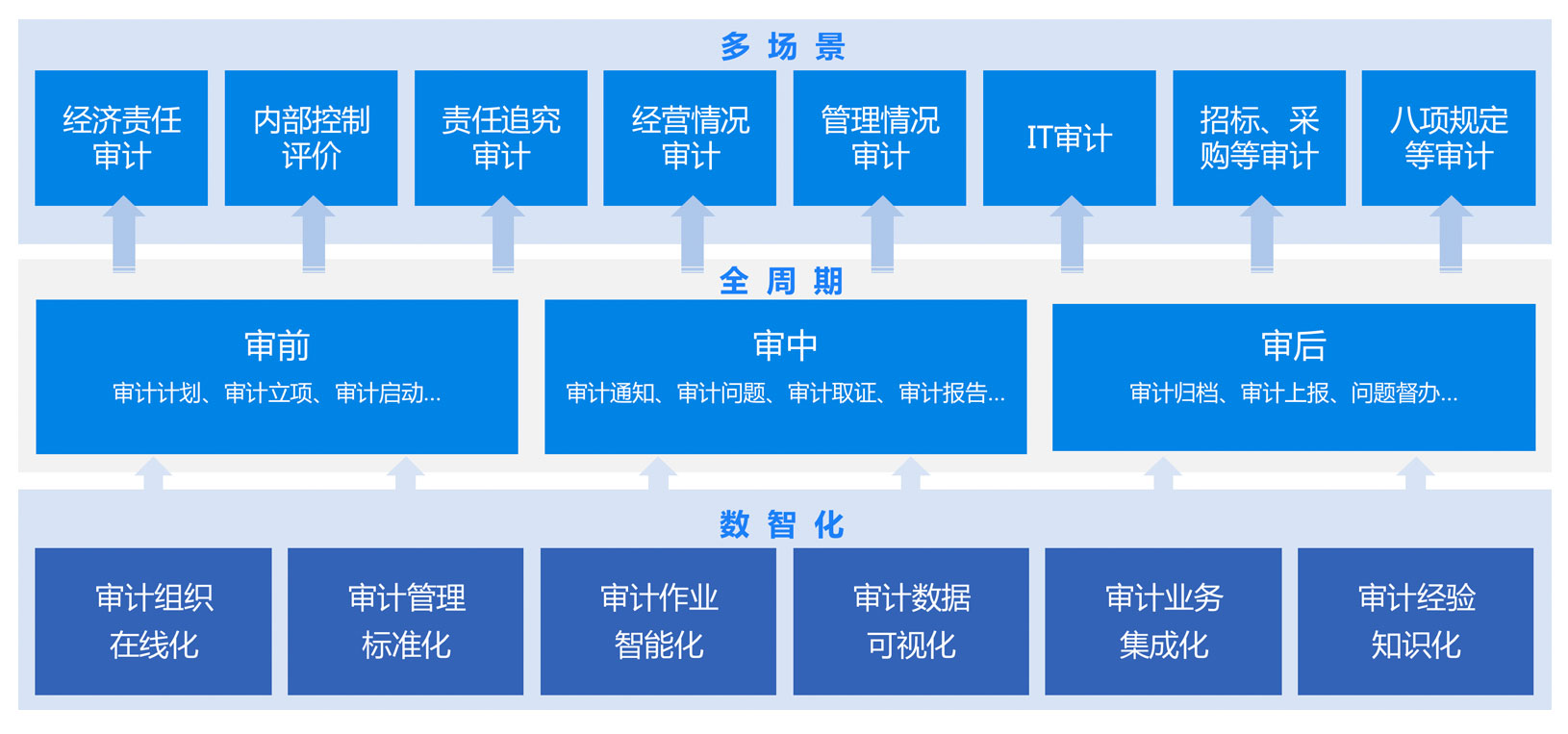 覆蓋審前、審中、審后階段,實(shí)現(xiàn)審計(jì)計(jì)劃、項(xiàng)目啟動(dòng)、取證、報(bào)告、整改等全周期管理,提升審計(jì)管理精細(xì)化水平