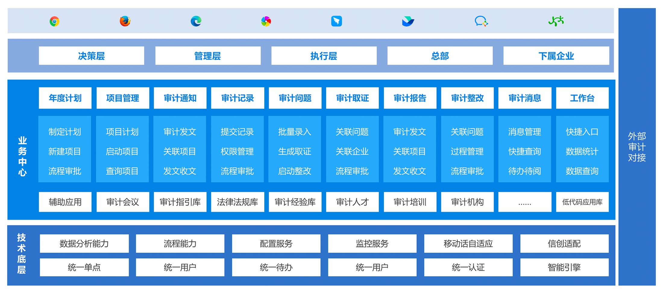 與財(cái)務(wù)管理、項(xiàng)目管理、內(nèi)控管理等業(yè)務(wù)信息系統(tǒng)相融合,通過(guò)數(shù)據(jù)穿透,優(yōu)化審計(jì)業(yè)務(wù)一體化管理,保障業(yè)務(wù)健康