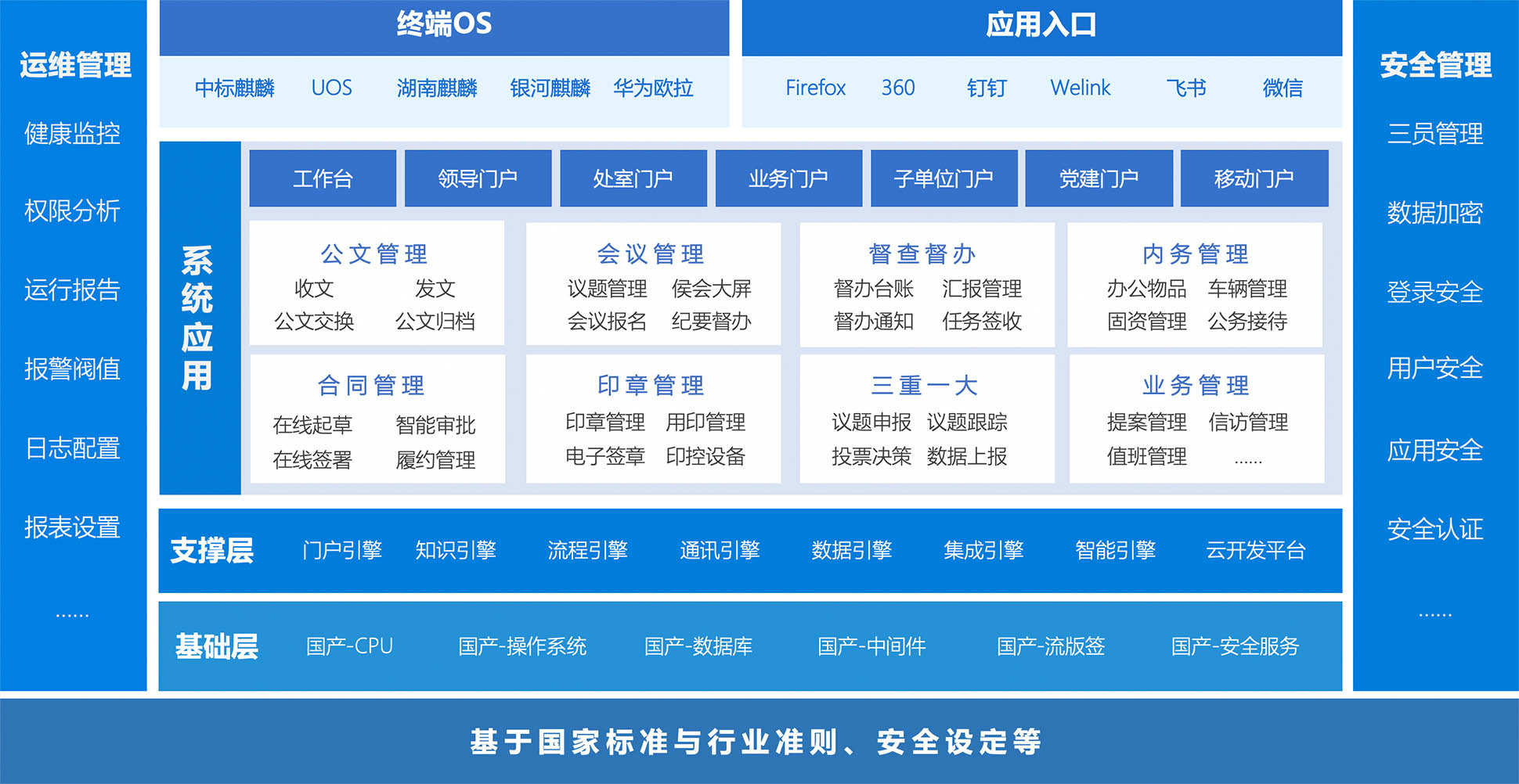 貫徹政務(wù)辦公“國產(chǎn)化”需求,搭建高標(biāo)準(zhǔn)辦公系統(tǒng),兼容XP、國密、國產(chǎn)操作系統(tǒng)與數(shù)據(jù)庫,保障運行安全可控